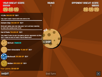 Speaking of cookies, there is a in-game shop where you can buy upgrades and skins from collected points. Unlocked things are stored in browser cookies to make them persistent across game sessions. This also means that if you or your browser clears the cookies from this website, you will loose your progress. So keep that in mind!